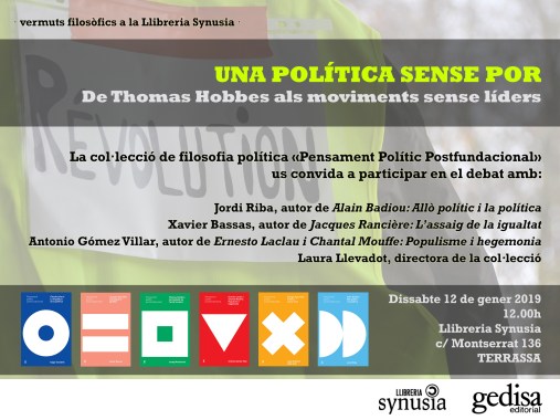 El próximo sábado 12 de enero, participaré en el vermut filosófico de la librería Synusia, en torno a “Una política sin miedo. De T. Hobbes a los movimientos sin líderes”, junto a Laura Llevadot, Jordi Ribas y Xavier Bassas. Será a las 12.00, en la librería Synusia, en Terrassa. Aquí toda la información del acto