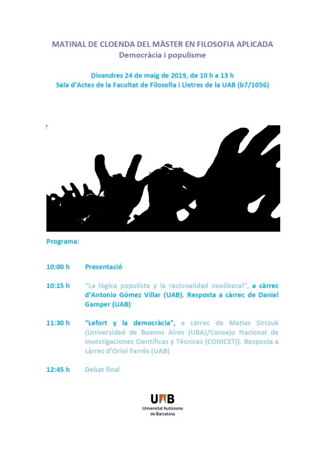 El próximo viernes 24 de mayo participaré en la jornada “Democracia y populismo”, en el marco del máster de Filosofía aplicadada de la UAB, con la conferencia “La lógica populista y la racionalidad neoliberal”. Al finalizar tendré un diálogo con Daniel Gamper. También participan Orriol Farrés y Matías Sirczuk. Será en la Sala d’Actes de la Facultat de Filosofia i Lletres de la UAB, a las 10.00.