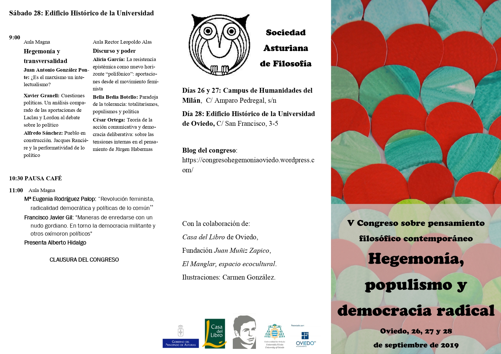 Este jueves estaré en Oviedo, en el V congreso sobre Pensamiento filosófico contemporáneo: Hegemonía, populismo y democracia radical. En él, presentaré la ponencia “El pueblo y el sujeto de lo político en E. Laclau y J. Rancière”, tratando de argumentar por qué considero errónea la lectura que Laclau hace de Rancière, tanto en los aspectos que Laclau entiende que los planteamientos de Rancière se acercan al suyo como en los que considera se distancia de su enfoque. Toda la información del congreso en este enlace