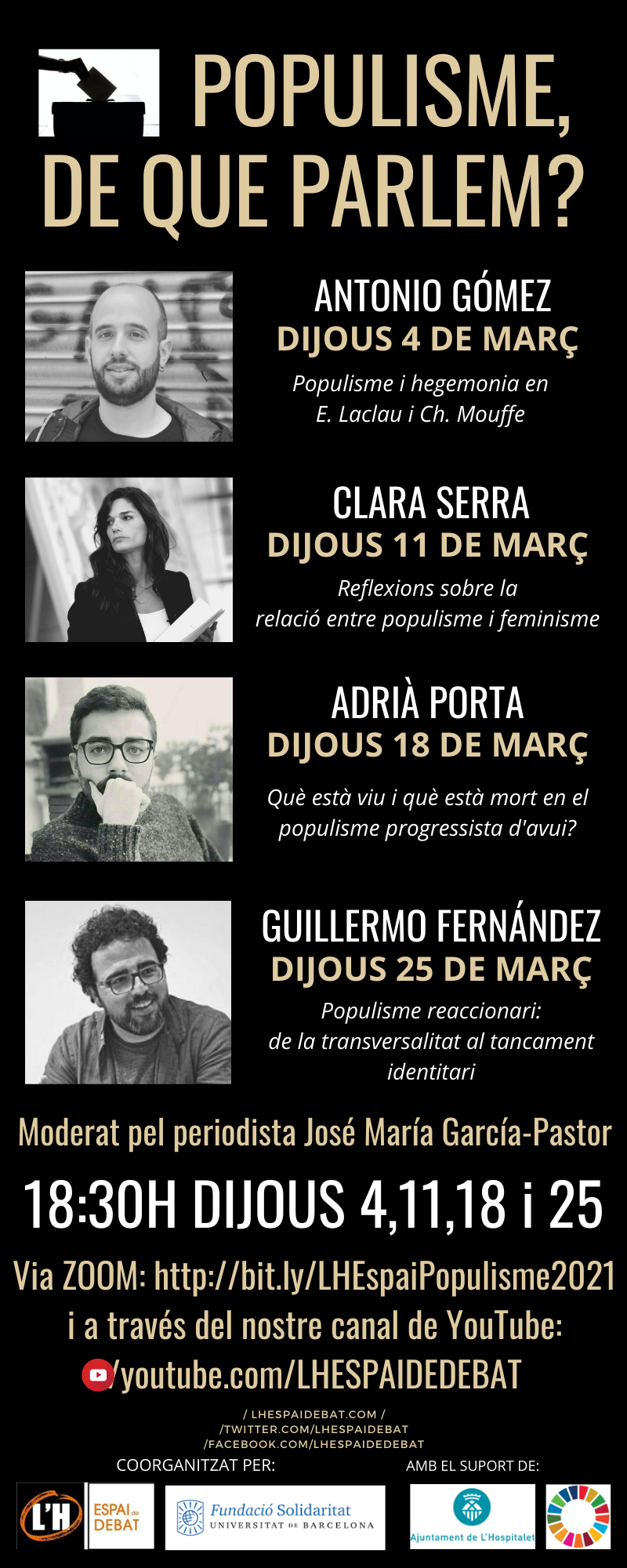 Desde “L’H Espai de Debat” han organizado este ciclo, “Populisme, de que parlem?”, en el que participaremos Clara Serra, Adrià Porta, Guillermo Fernández y un servidor. Se podrá seguir a través de Zoom (el enlace aparece en el cartel) y a través del canal de youtube: https://www.youtube.com/c/LHESPAIDEDEBAT/featured