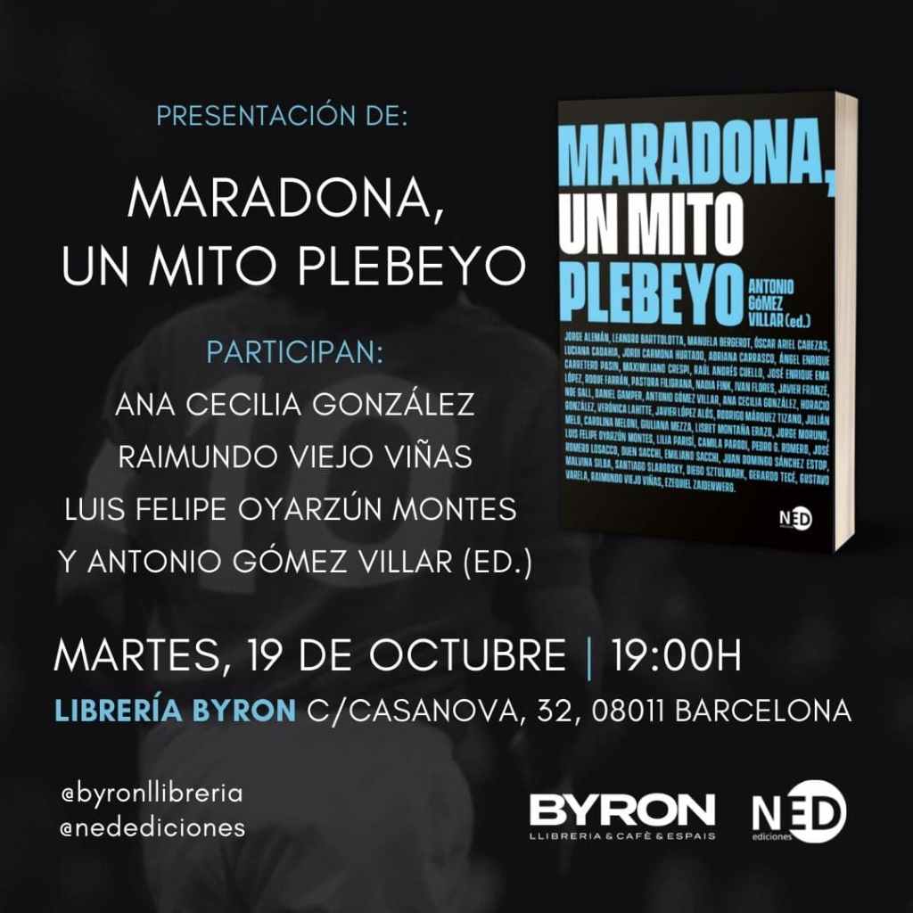 El próximo martes 19 de octubre, a las 19.00, presentamos el libro “Maradona, un mito plebeyo”, en la librería Byron (carrer Casanova, 32, Barcelona). Participarán las autoras del libro Ana Cecilia González, Raimundo Viejo, Luis Felipe Oyarzún y un servidor.