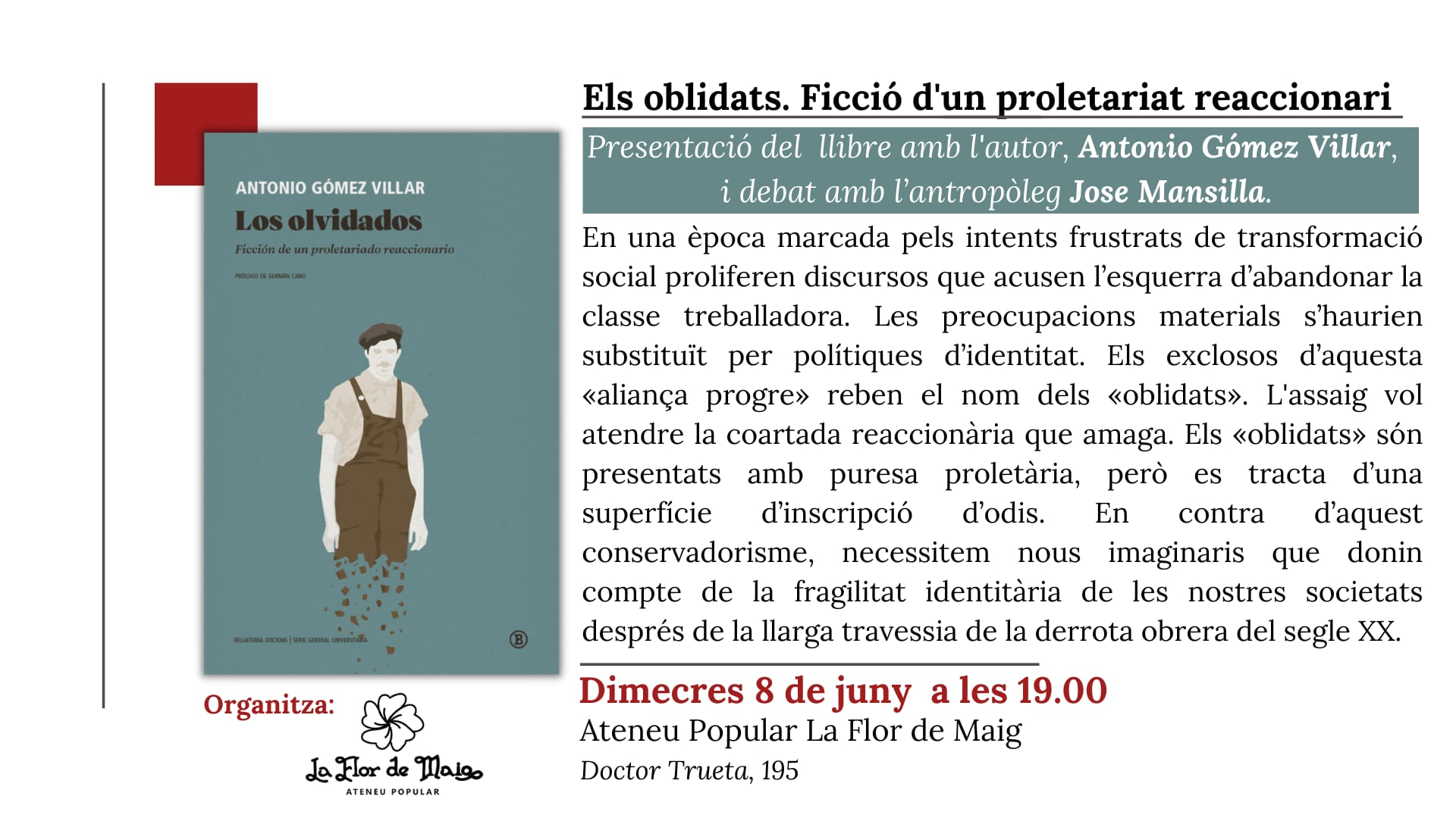El próximo miércoles 8 de junio a las 19.00, el Ateneu Popular La Flor de Maig ha organizado esta presentación del libro Los olvidados. Ficción de un proletariado reaccionario, junto al antropólogo José Mansilla. Muy agradecido por la organización del acto y el interés en el libro. Con ganas de encontrarnos y dialogar.