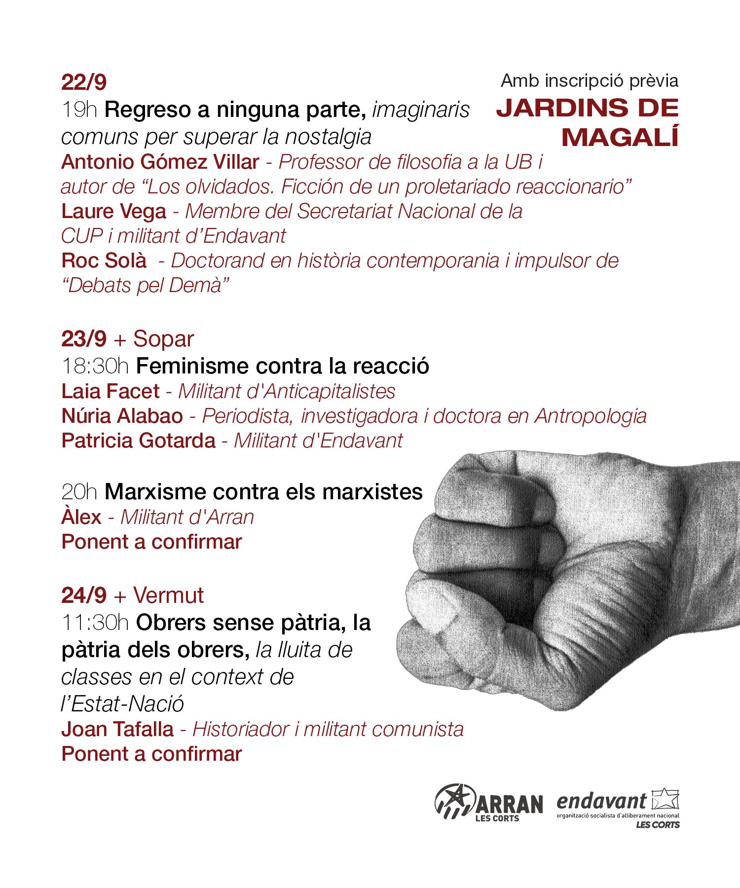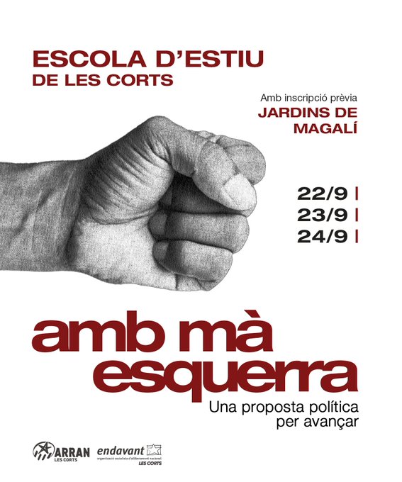 Les organitzacions Endavant i Arran Les Corts han organitzat aquestes jornades, “Amb mà esquerra”, en el marc de l’Escola d’Estiu d’enguany. Aquestes són les xerrades, ponents i continguts. Dijous 22 participaré amb Laure Vega i Roc Solà a la taula titulada “Regreso a ninguna parte. Imaginaris comuns per superar la nostàlgia”. Serà a les 19.00, als Jardins de Magalí.