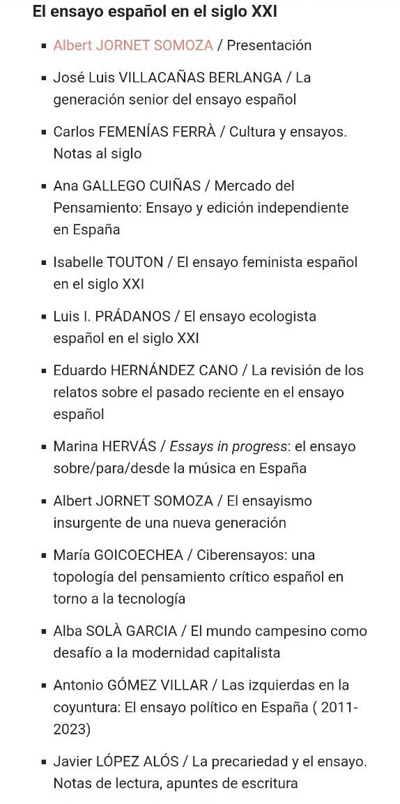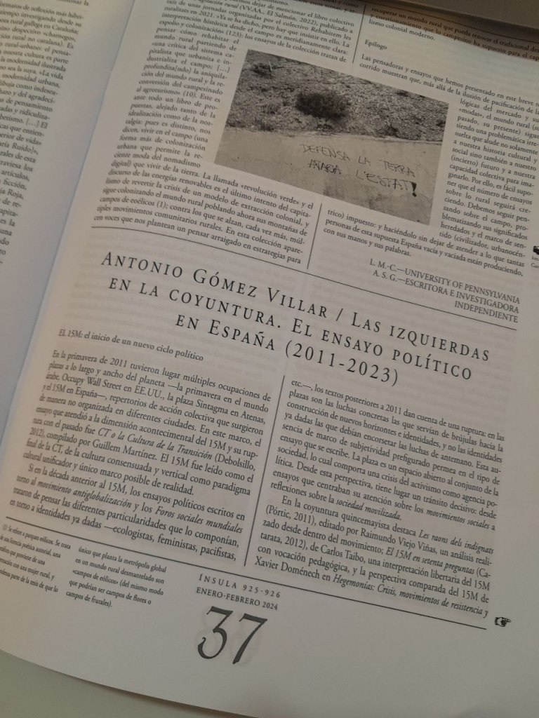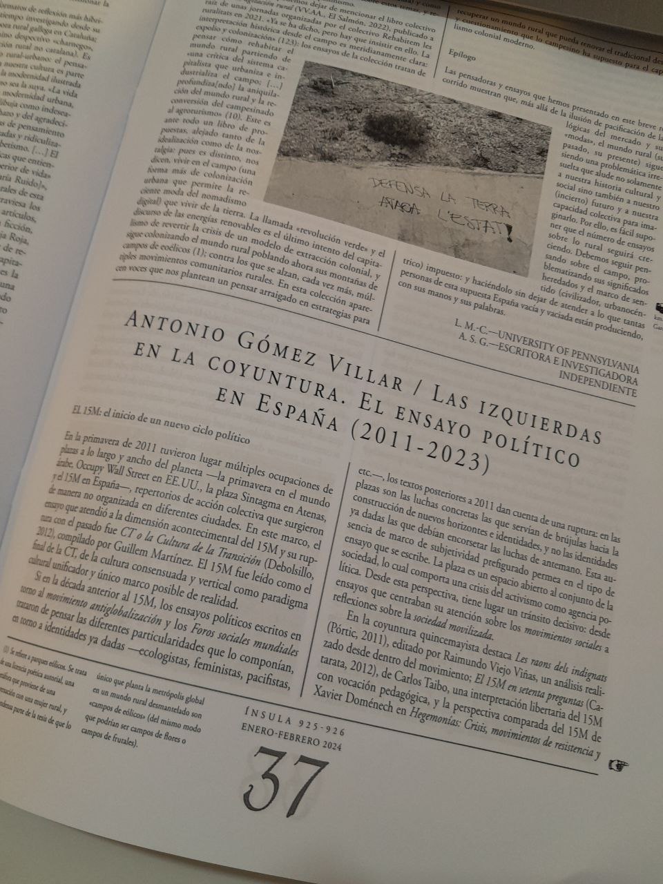 La Revista Ínsula ha publicado en enero el monográfico “El ensayo español en el siglo XXI”, coordinado por Albert Jornet y Carlos Femenías, quienes han realizado un trabajo estupendo. Contiene notables contribuciones desde diferentes miradas. Entre ellas, mi texto “Las izquierdas en la coyuntura. El ensayo político en España (2011-2023)”. Pincha aquí para acceder al número completo
