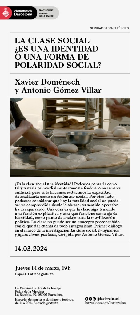 Me hace mucha ilusión este diálogo con Xavier Domènech, en el marco del proyecto de investigación que dirijo en La Virreina, “La clase social. Imaginarios y figuraciones políticas”. La pregunta que articula esta primera sesión es acerca de si la clase social es una identidad o una forma de polaridad social. Muchas gracias a Lúcia Prancha por cedernos amablemente la imagen que acompaña la actividad. Toda la información pinchando aquí