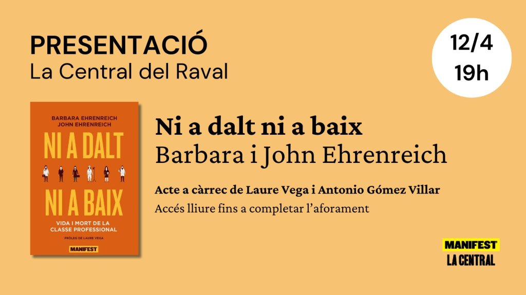 El proper divendres 12 d’abril, Laure Vega i jo presentarem a La Central del Raval (19.00 hr) el llibre Ni a dalt ni a baix: vida i mort de la classe professional, traduït al català per l’editorial Manifest. Moltes ganes del diàleg amb la Laure, que ha escrit un gran pròleg per a un magnífic llibre. Entrada lliure i gratuïta fins a completar aforament.