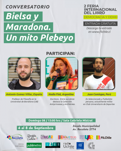 El próximo domingo 8 de septiembre, en la 2 Feria Internacional del Libro de Recoleta (Santiago de Chile), participaré en el conversatorio “Bielsa y Maradona. Un mito plebeyo”, junto a Nadia Fink y Juan Cominges, a las 15.00 hrs. La actividad gratuita con inscripción previa pinchando aquí
