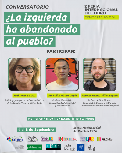 El próximo viernes 6 de septiembre, en la 2 Feria Internacional del Libro de Recoleta (Santiago de Chile), participaré en un conversatorio con Jodi Dean y Juan Fujita Hirose, en torno a la pregunta “¿La izquierda ha abandonado al pueblo?”, a las 18.00 hrs. Actividad gratuita con inscripción previa pinchando aquí