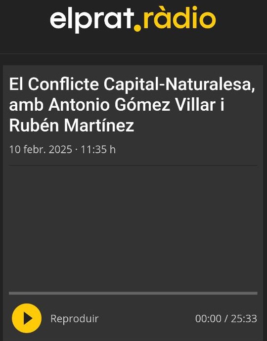 Esta mañana, en el El Magacín matinal de Elprat.radio, Rubén Martínez y un servidor hemos estado charlando con Isa Gonzalo sobre el conflicto capital/naturaleza y algunas de sus implicaciones. Pincha aquí para escuchar el audio