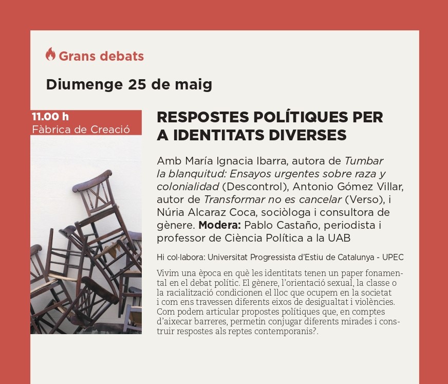 “Vivim una època en què les identitats tenen un paper fonamental en el debat polític. El gènere, l’orientació sexual, la classe o la racialització condicionen el lloc que ocupem en la societat i com ens travessen diferents eixos de desigualtat i violències. Com podem articular propostes polítiques que, en comptes d’aixecar barreres, permetin conjugar diferents mirades i construir respostes als reptes contemporanis?”