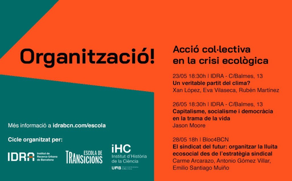 IDRA, Escola de Transicions i Institut d’Història de la Ciència (UAB) han reunit tres activitats per obrir i reprendre converses que ens ajuden a pensar millor l’època que vivim. Aquest cicle vol convocar pensament crític i pràctiques polítiques per articular estratègies davant una crisi que és climàtica, política i social. Una crisi sistèmica que exigeix tota la creativitat col·lectiva per disputar el present i el futur. Tota la informació en aquest link