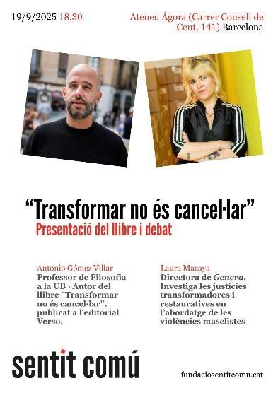 La Fundació Sentit Comú ha organitzat aquesta presentació del llibre Transformar no es cancelar (Verso), amb la Laura Macaya. Moltes ganes d’aquest diàleg sobre cultura de cancel·lació, transformació política i justícia feminista. Serà el divendres 19 de setembre, a les 18.30 h. a l’Ateneu Àgora (Carrer Consell de Cent, 141). Tota la informació en aquest link