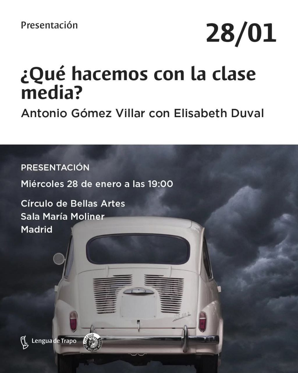 El miércoles 28 de enero presento en el Círculo de Bellas Artes de Madrid el ensayo ¿Qué hacemos con la clase media? (Lengua de Trapo). Será a las 19.00 horas en la sala María Moliner. En la presentación tendré el placer de dialogar con Elisabeth Duval.