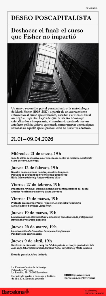 Laure Vega y David Caño han comisariado este magnífico ciclo en La Virreina. Centre de la imatge, titulado “Deseo poscapitalista. Deshacer el final: el curso que Fisher no impartió”. Las diferentes sesiones se desarrollarán entre enero y abril de 2026. Pincha aquí para obtener más información del ciclo