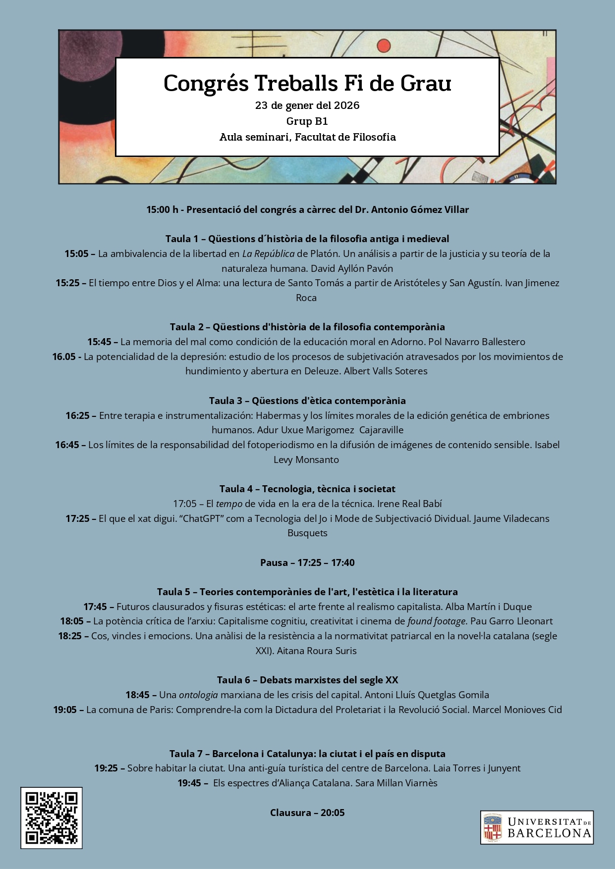 Congrés Treballs Fi de Grau January 18, 2026 ~ Antonio Gómez Villar El proper divendres 23 de gener es defensen els 15 treballs fi de grau que he tingut el plaer de tutoritzar aquest curs. És un dels dies més xulos a la Uni Share this: Share on X (Opens in new window) X Share on Facebook (Opens in new window) Facebook Like Loading... Related