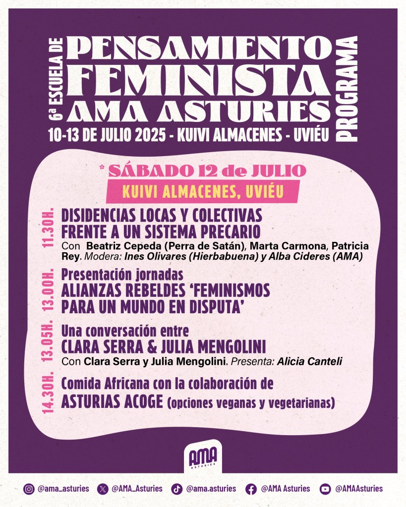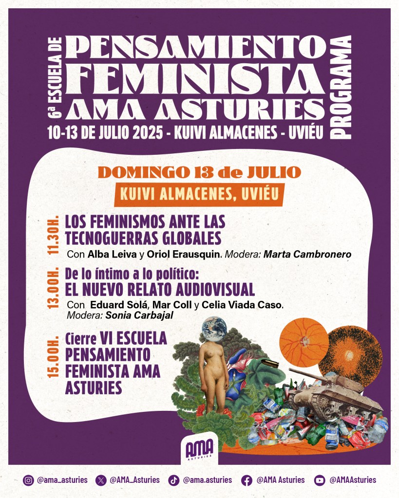 Ya está disponible el programa de la VI Escuela de Pensamiento Feminista AMA. Los próximos 10, 11, 12 y 13 de julio en Kuivi, Oviedo. Tremendo programa el que han armado las compañeras. La entrada es libre y gratuita.