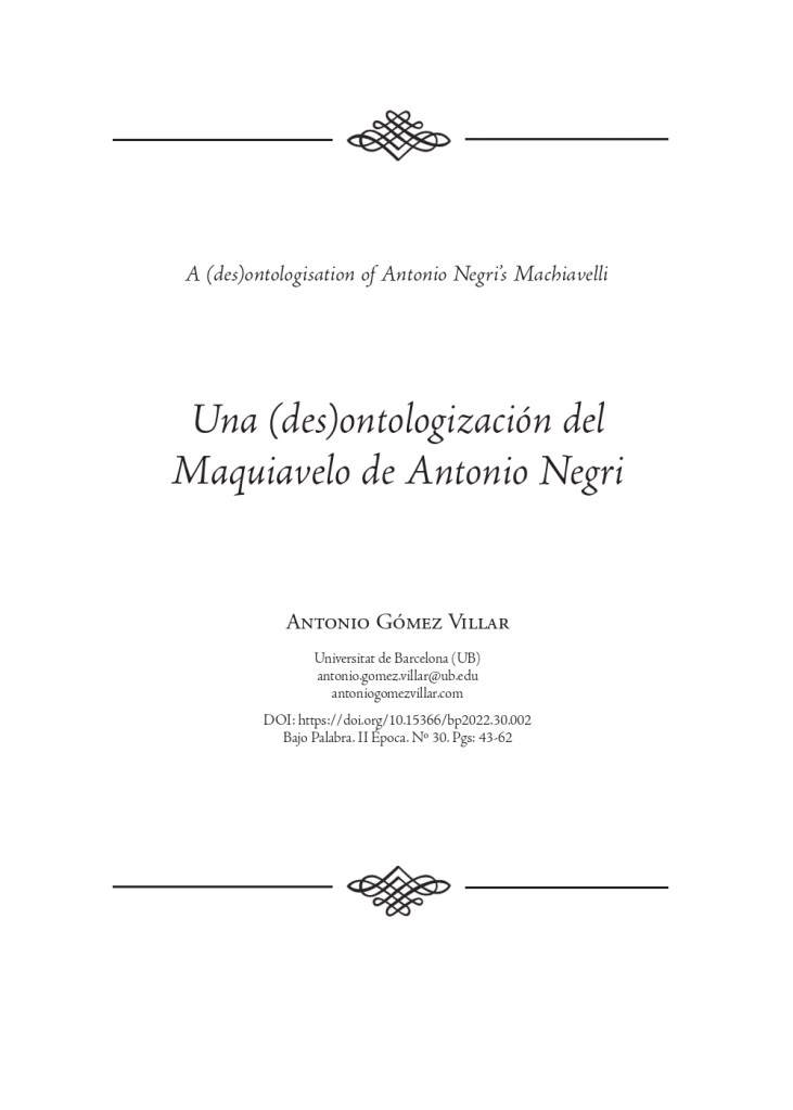 La revista de Filosofía Bajo Palabra ha publicado en su último número de mi artículo “Una (des)ontologización del Maquiavelo de Antonio Negri”. Pincha aquí para leer el artículo