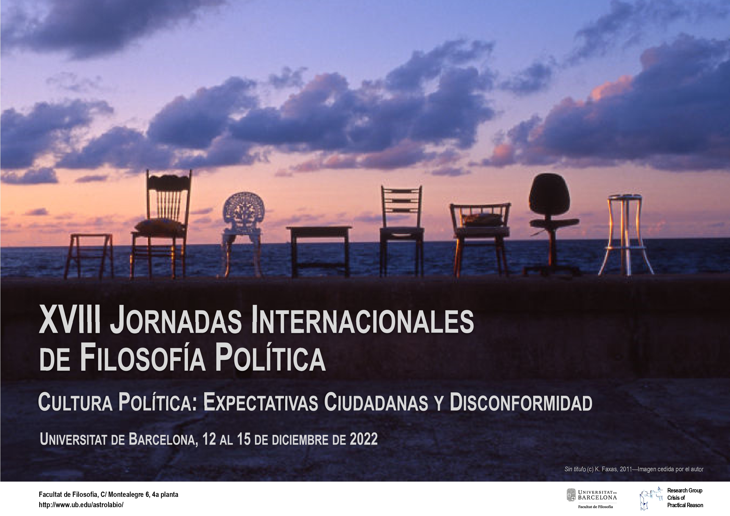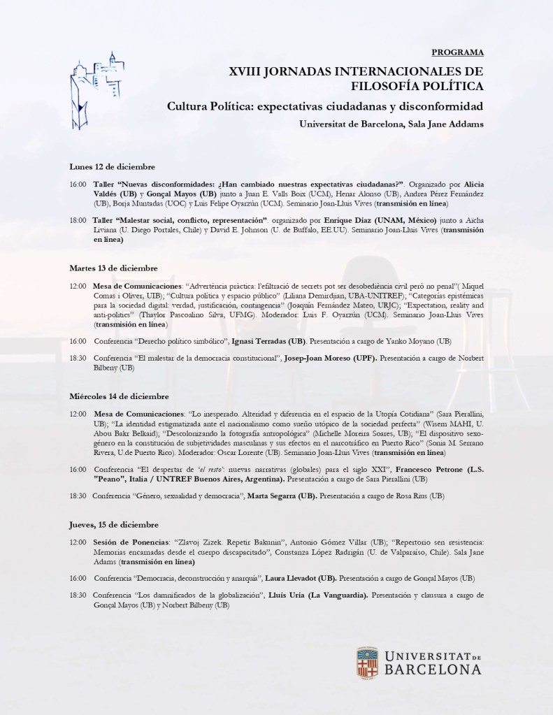 Ya está disponible el programa de las “XVIII Jornadas Internacionales de Filosofía Política” de la UB, que llevan por tíutlo “Cultura política: expectivativas ciudadas y disconformidad”. En el marco de las jornadas, el jueves 15 de diciembre presentaré la ponencia “S. Zizek: repetir Bakunin”. Será en la Facultat de Filosofía de la UB, a las 12.00 horas, en la sala Jane Addams.