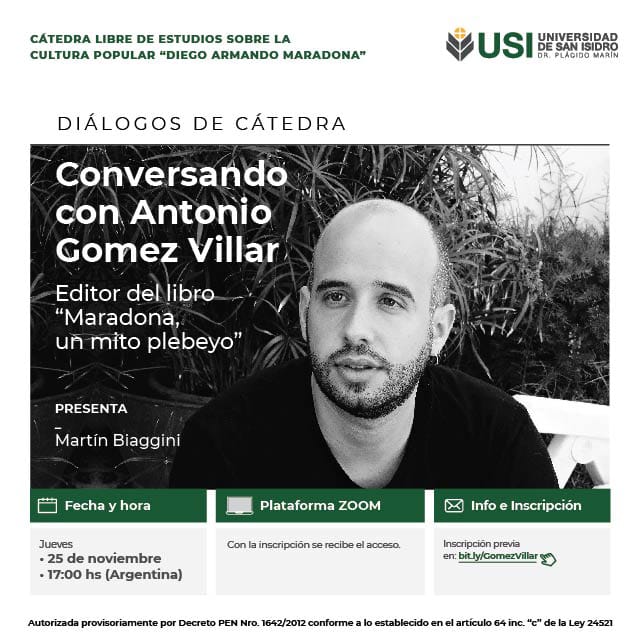 El próximo jueves 25 de noviembre, a las 17.00 (hora en Argentina), la Cátedra libre de estudios sobre la cultura popular “Diego Armando Maradona”, de la Universidad de San Isidro, ha organizado esta conversación con Martín Biaggini. Será online. En el flyer toda la info.