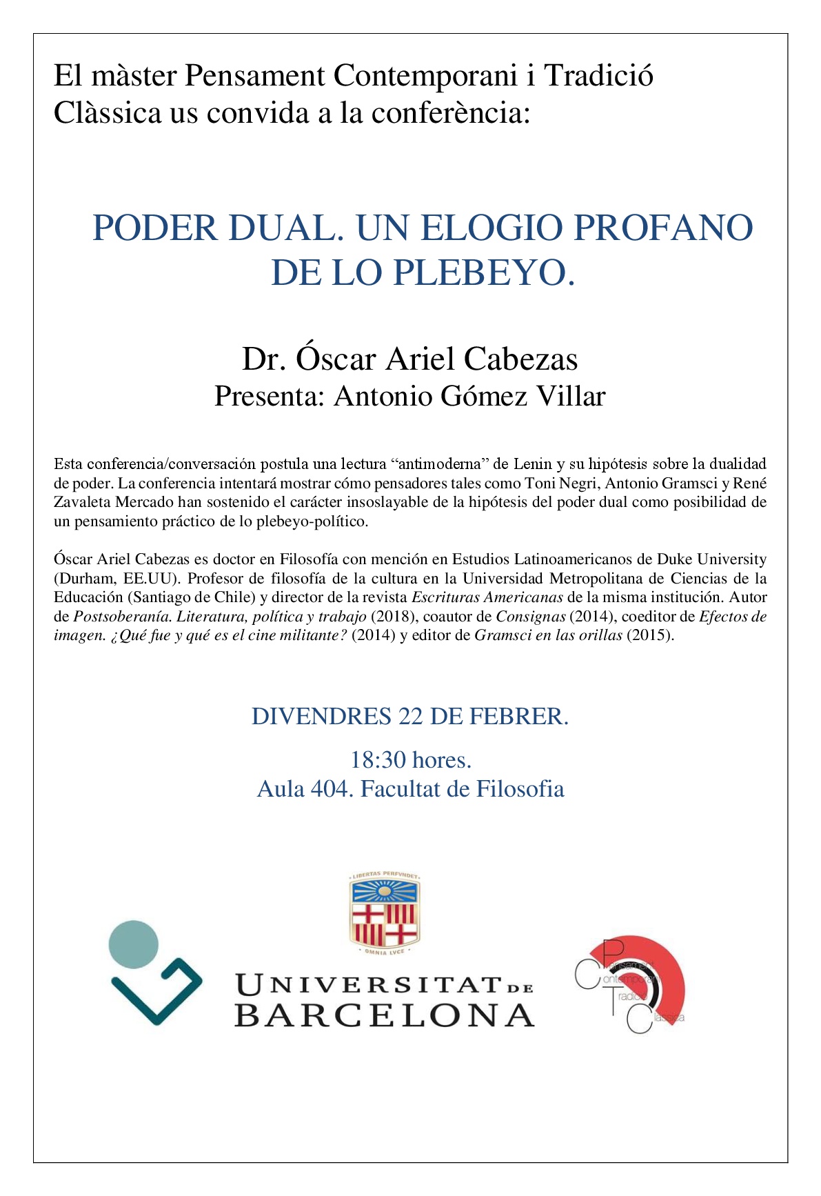 El próximo viernes 22 de febrero, Óscar Ariel Cabezas dará la conferencia “Poder dual. Un elogio profano de lo plebeyo”, que hemos organizado en el marco del máster de la Universitat de Barcelona (UB) “Pensament Contemporani i Tradició Clàssica”. Será a las 18.30, en el aula 404, en la Facultat de Filosofía de la UB (Carrer de Montalegre, 6).